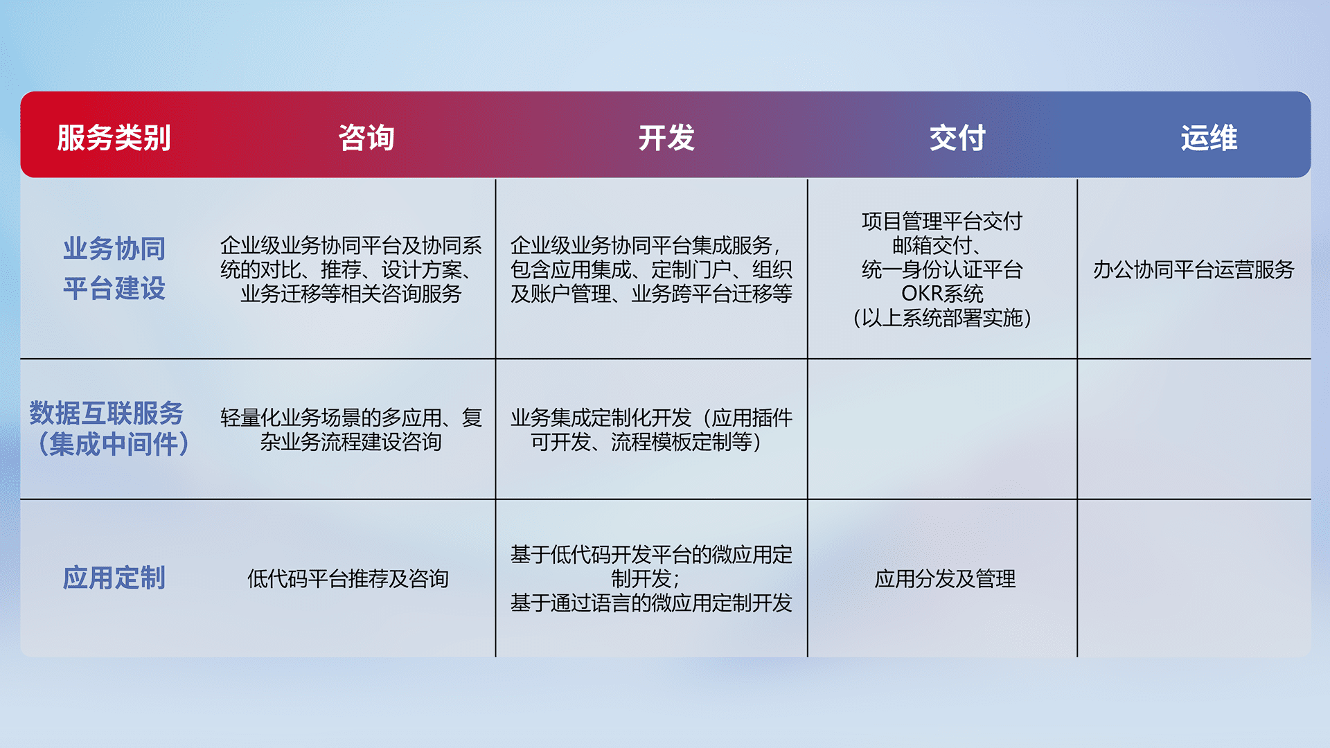 针对钉钉、、、企微、、IDaas等平台级产品提供产品的规划、、、方案、、交付、、定制化开发等服务,,实现如统一协同办公、、、、智能客户服务、、混合会议管理、、、、智能数据查询、、、等业务场景,,实现数字化转型。。。。