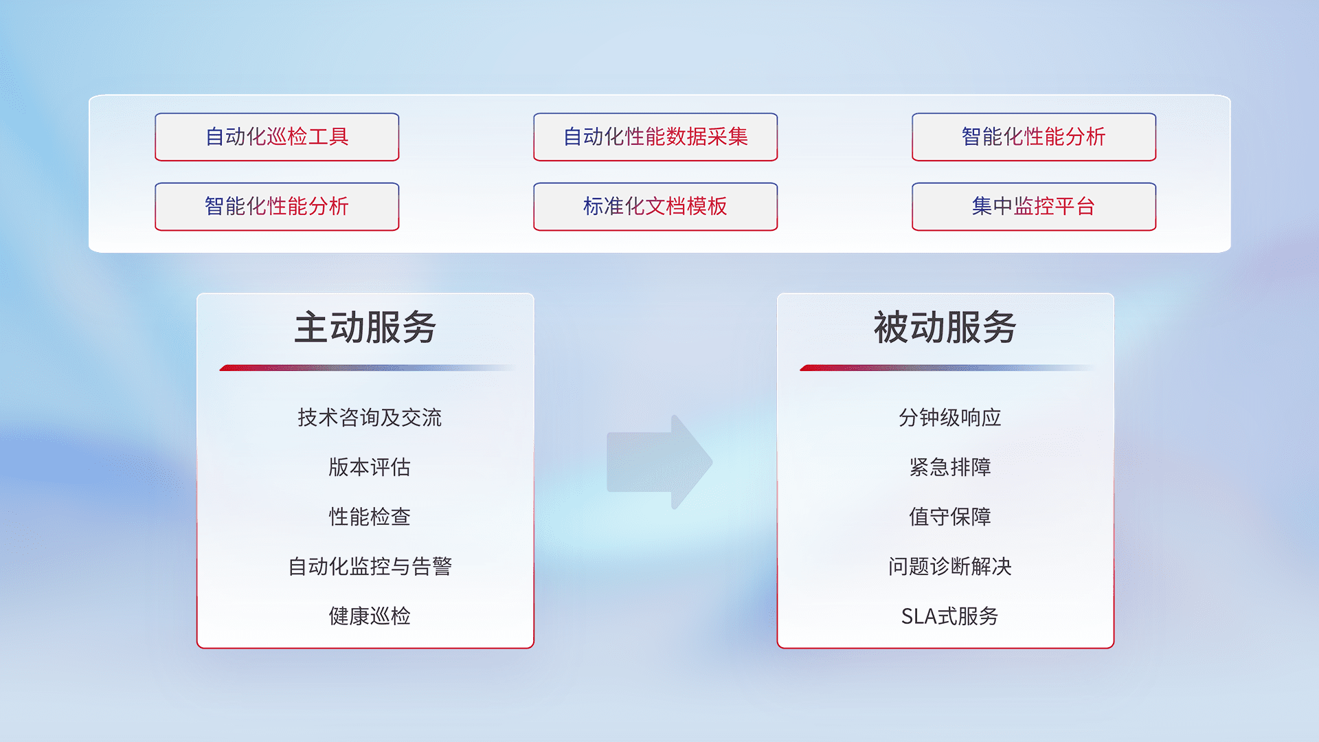 智能化工具和标准化文档,,保障服务质量,,,提供主动服务(包含技术咨询、、版本评估、、性能检查、、、、自动化监控与告警、、、健康巡检)和被动服务包含(分钟级响应、、、紧急排障、、、值守保障、、、问题诊断解决、、SLA服务)。。